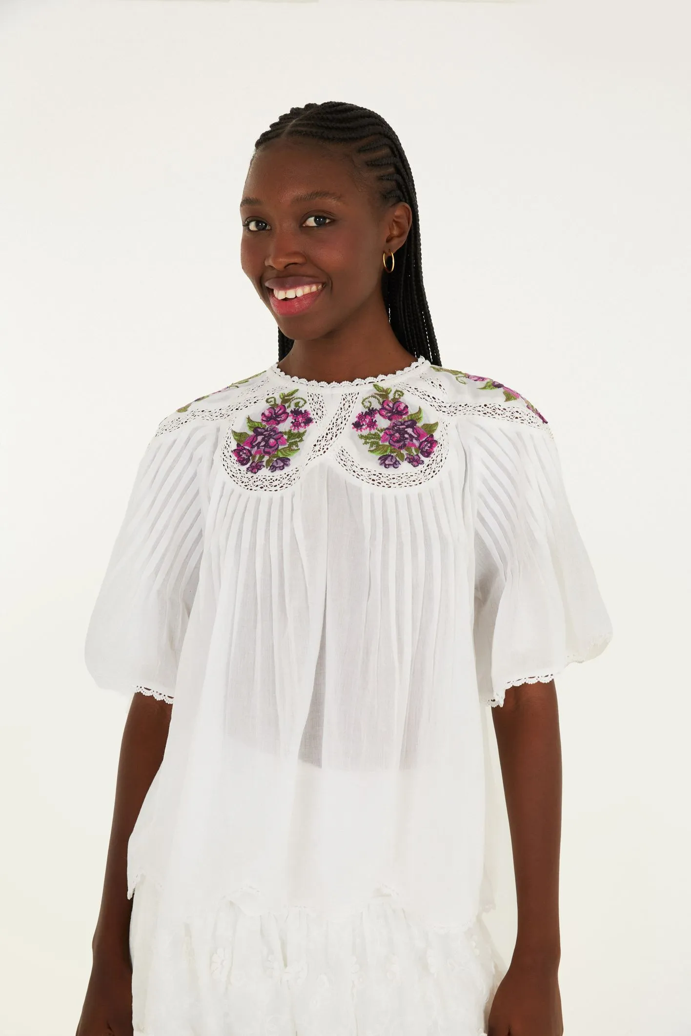 Bata bordada poesia de flor. com decote arredondado e mangas curtas, a peça destaca-se pelo bordado delicado no busto e nos ombros, trazendo detalhes únicos e inspiradores. a modelagem solta proporciona conforto e leveza, sendo perfeita para ocasiões casuais e momentos especiais. FARM RIO original - verão 26.