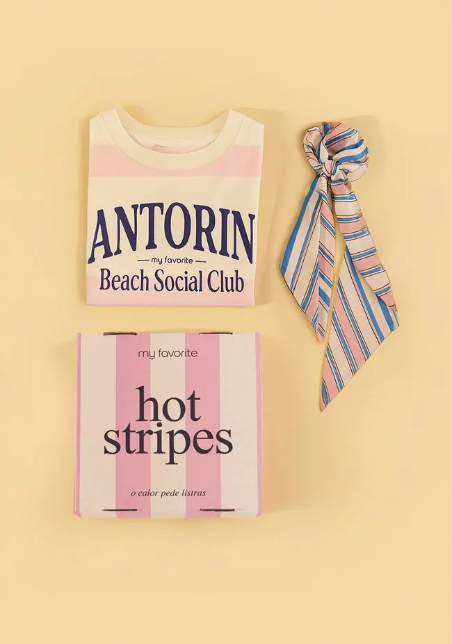 Kit composto por t-shirt oversized com estampa listrada, gola redonda e mangas curtas. Acompanha lenço estampado perfeito para múltiplas amarrações. Embalado em caixa personalizada my favorite, ideal para presentear(ou se presentear).