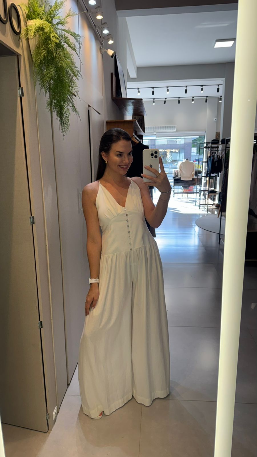 Macacão botões pantalona. com alças finas e decote em v, possui botões que agregam charme e praticidade. a modelagem ampla e fluida da pantalona proporciona movimento leve e casual. ideal para um dia ensolarado ou um jantar descontraído à beira-mar. FARM RIO original - verão 26.