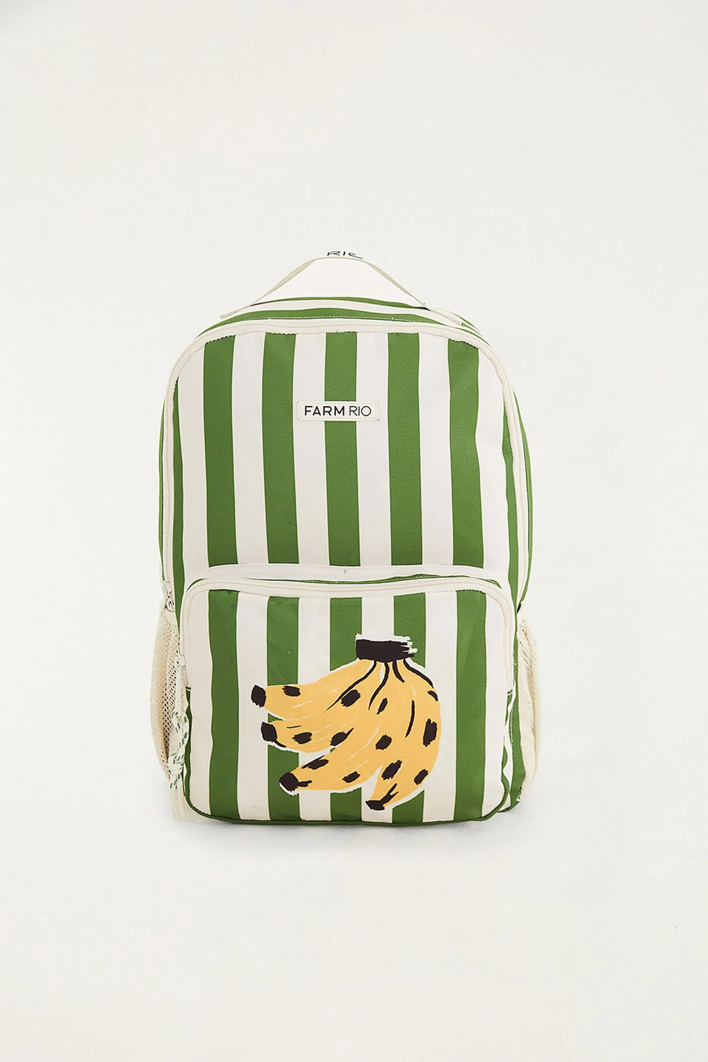 Mochila me leva banana tropical. possui um compartimento amplo e um bolso frontal, ambos fechados por zíper personalizado. as alças de ombro são acolchoadas e ajustáveis, trazendo conforto no dia a dia. o que não se veste, se vive. chegou farm etc, a marca de lifestyle da farm rio.