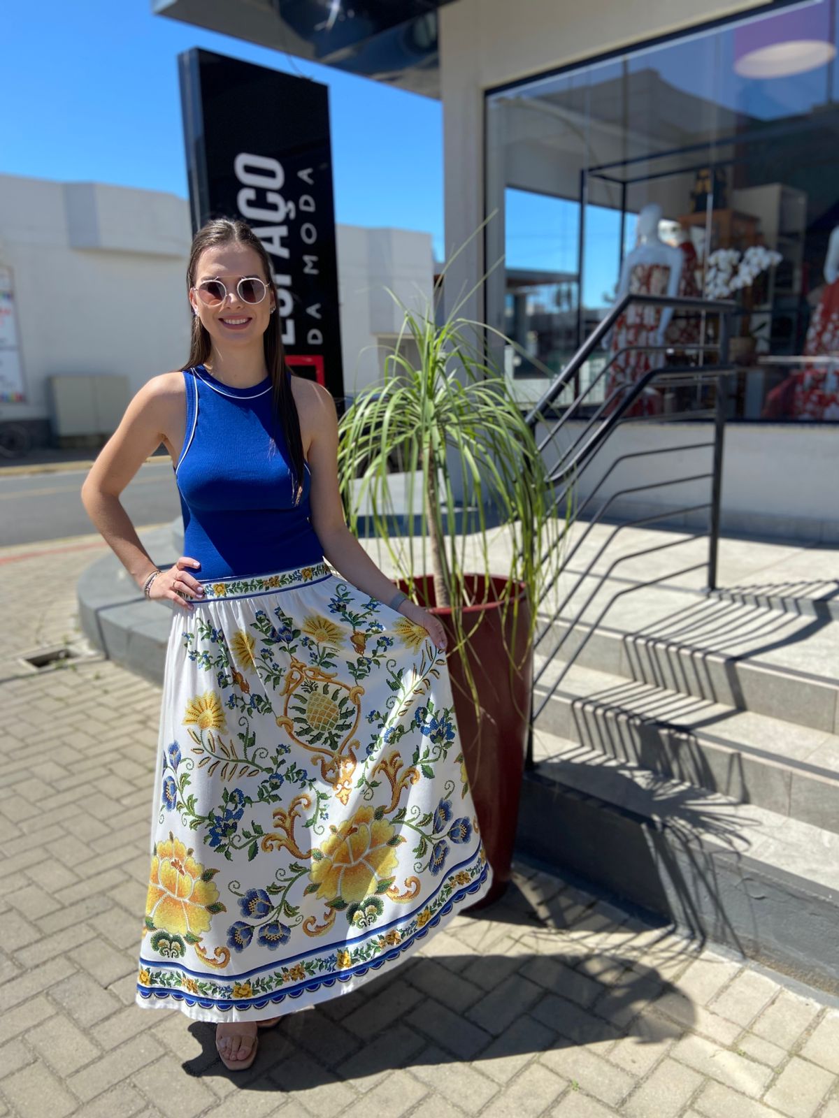 Saia estampada floral Emília. esta peça traz um corte fluido com cintura alta e comprimento midi, destacando um caimento leve e confortável. os acabamentos delicados elevam o charme da saia, que se adapta bem a ocasiões casuais ou jantares especiais. FARM RIO original - alto verão 26.