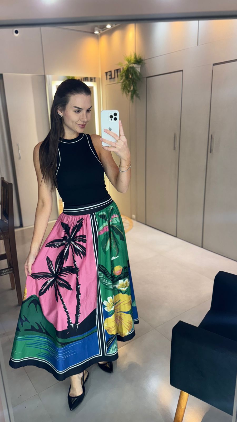 Saia estampada oásis lenço. apresenta cintura alta e modelagem fluida que destaca a leveza do movimento. com tecido de toque suave, é ideal para dias ensolarados e encontros casuais. escolha perfeita para combinar com blusas básicas ou tops despojados, enriquecendo seu visual com autenticidade. FARM RIO original - alto verão 26.