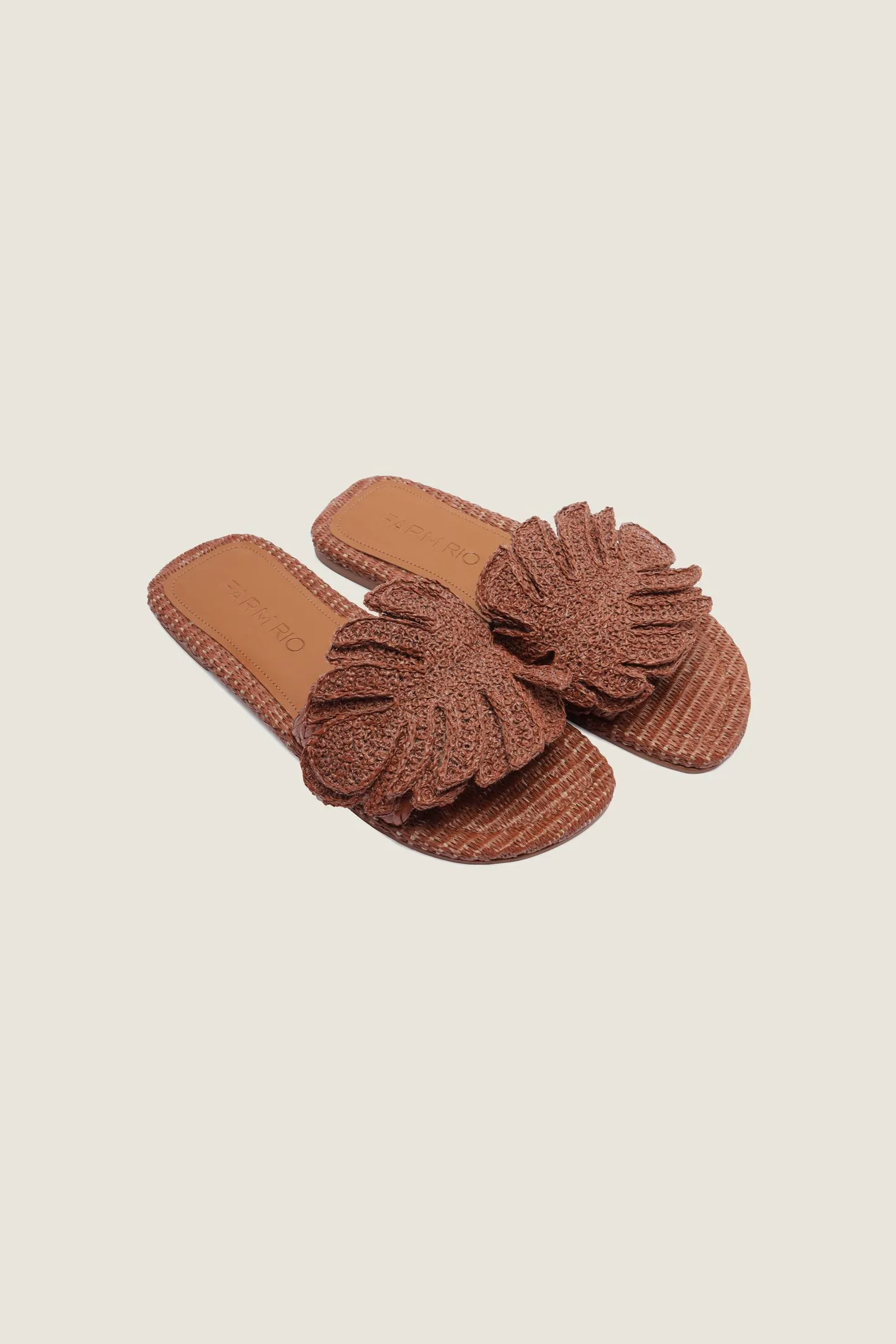 Sandália rasteira slide monstera ráfia. o modelo traz uma tira larga com aplicação sobreposta de duas peças em ráfia no formato de maxi folha. possui salto rasteiro e uma sola laqueada, palmilha forrada com tela de ráfia e uma palmilha 3/4 em Pu, assinatura original e costuras em pesponto por todo o contorno. esta é uma peça exclusiva da linha Apé, a nova linha de calçados FARM Rio.