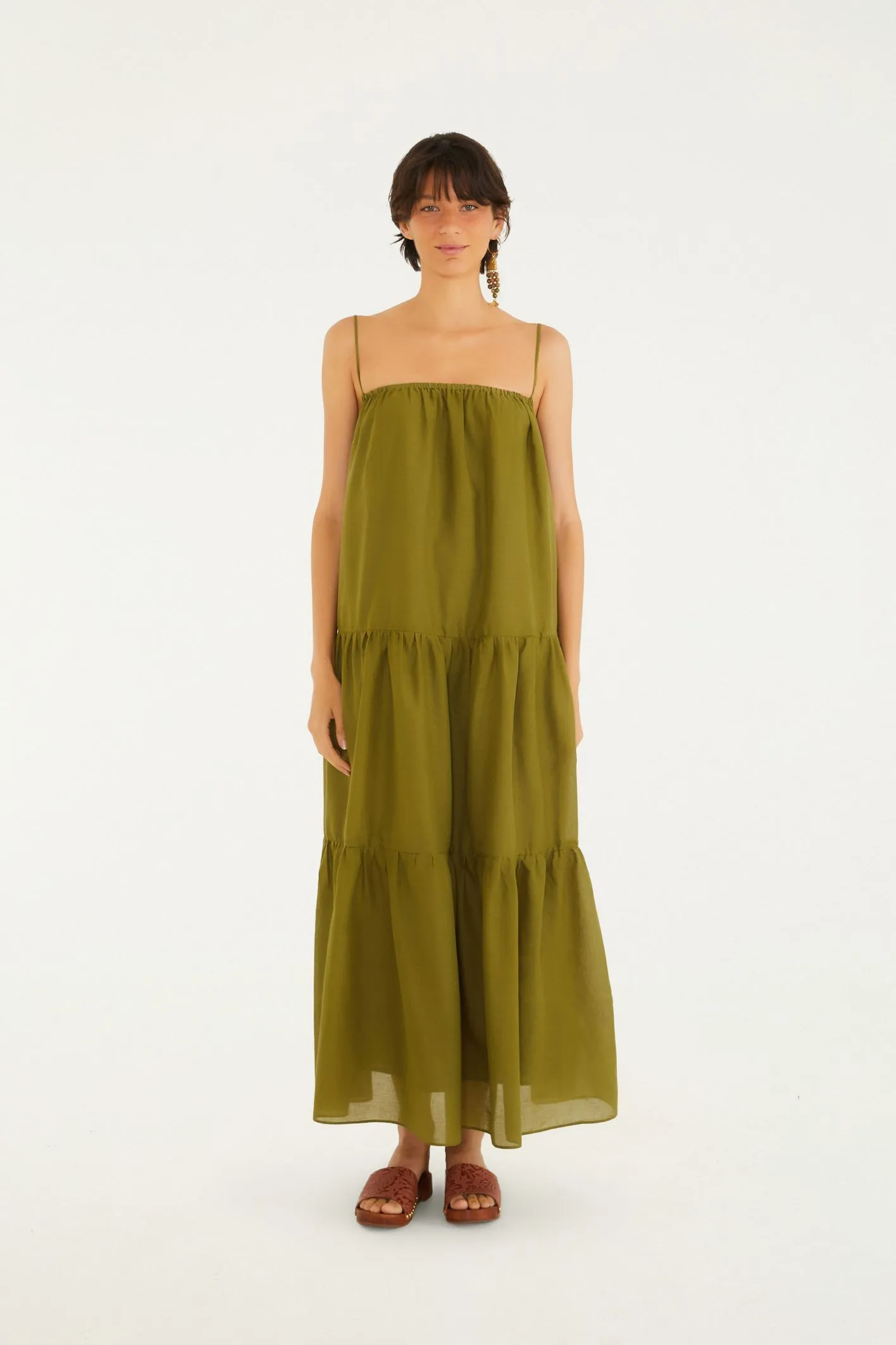 Vestido alcinhas marias. com alças finas e corte fluido, é perfeito para momentos especiais ou um passeio casual. o decote reto traz um toque moderno, enquanto os babados em camadas adicionam movimento e leveza à peça. a combinação ideal entre conforto e estilo. FARM RIO original - verão 26.