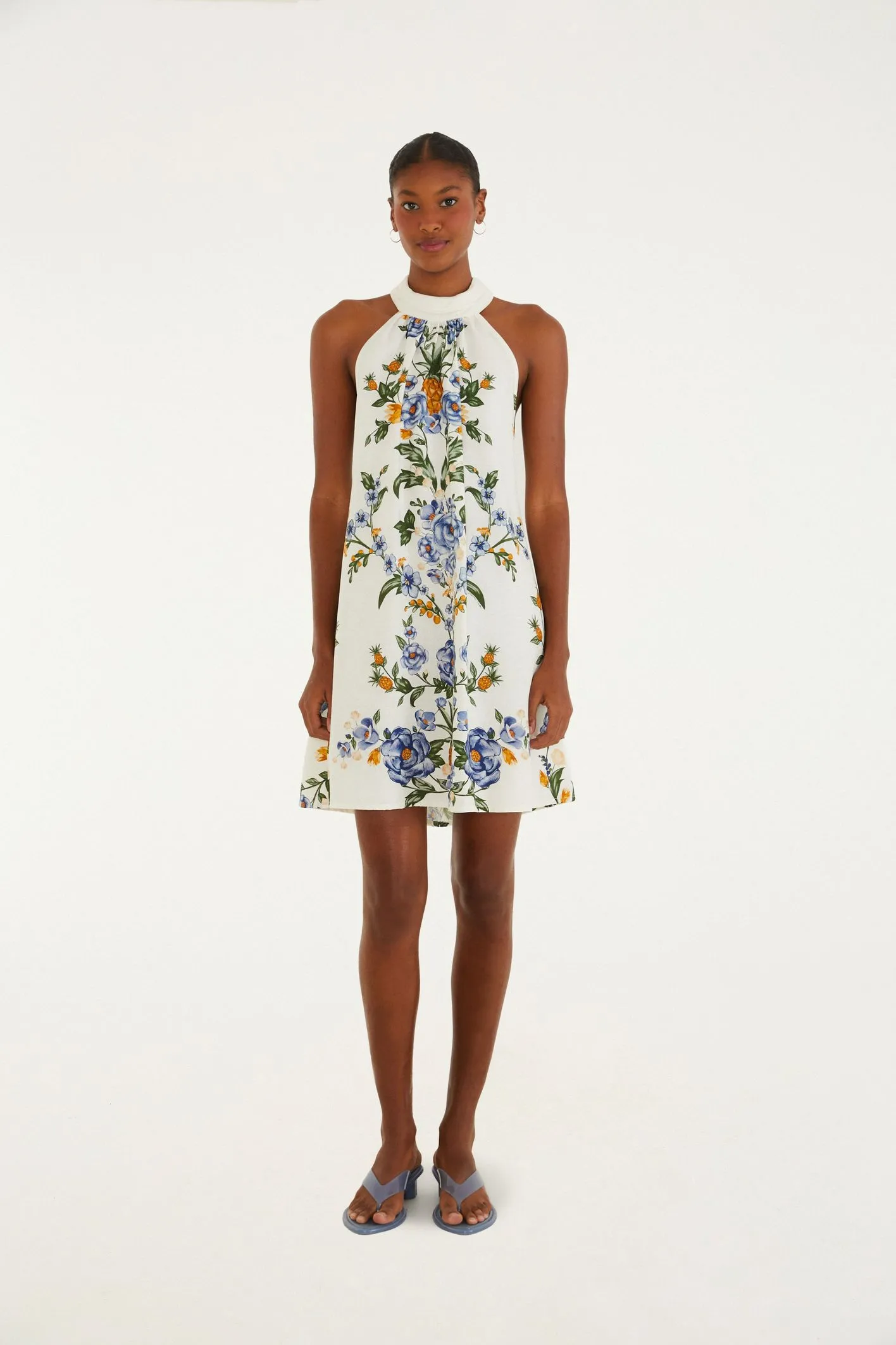 Vestido curto estampado floral penélope. traz um decote redondo clássico, com mangas amplas que fluem de forma suave. confeccionado em tecido leve, oferece um caimento solto e liberdade nos movimentos. perfeito para ocasiões casuais que pedem estilo e conforto sem esforço. FARM RIO original - verão 26.