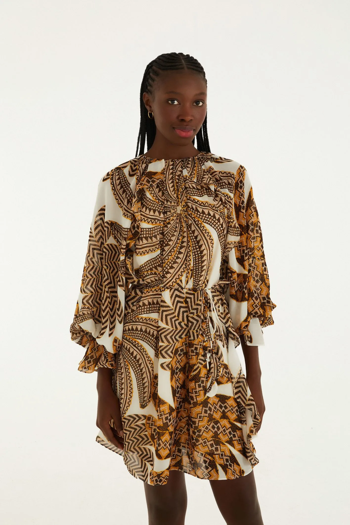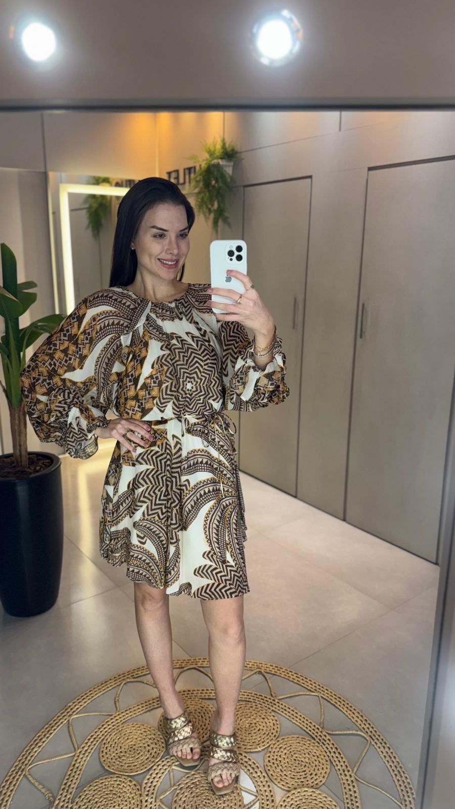 Vestido curto estampado vanahu. com decote redondo e mangas amplas que trazem fluidez, esta peça é ideal para compor um look casual e cheio de personalidade. o acabamento em babados nas mangas e na barra eleva o design, garantindo movimento e leveza. perfeito para dias ensolarados e ocasiões especiais em climas quentes. FARM RIO original - verão 26.