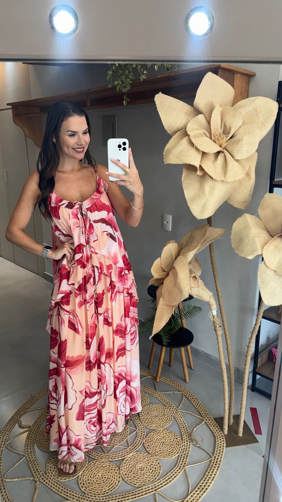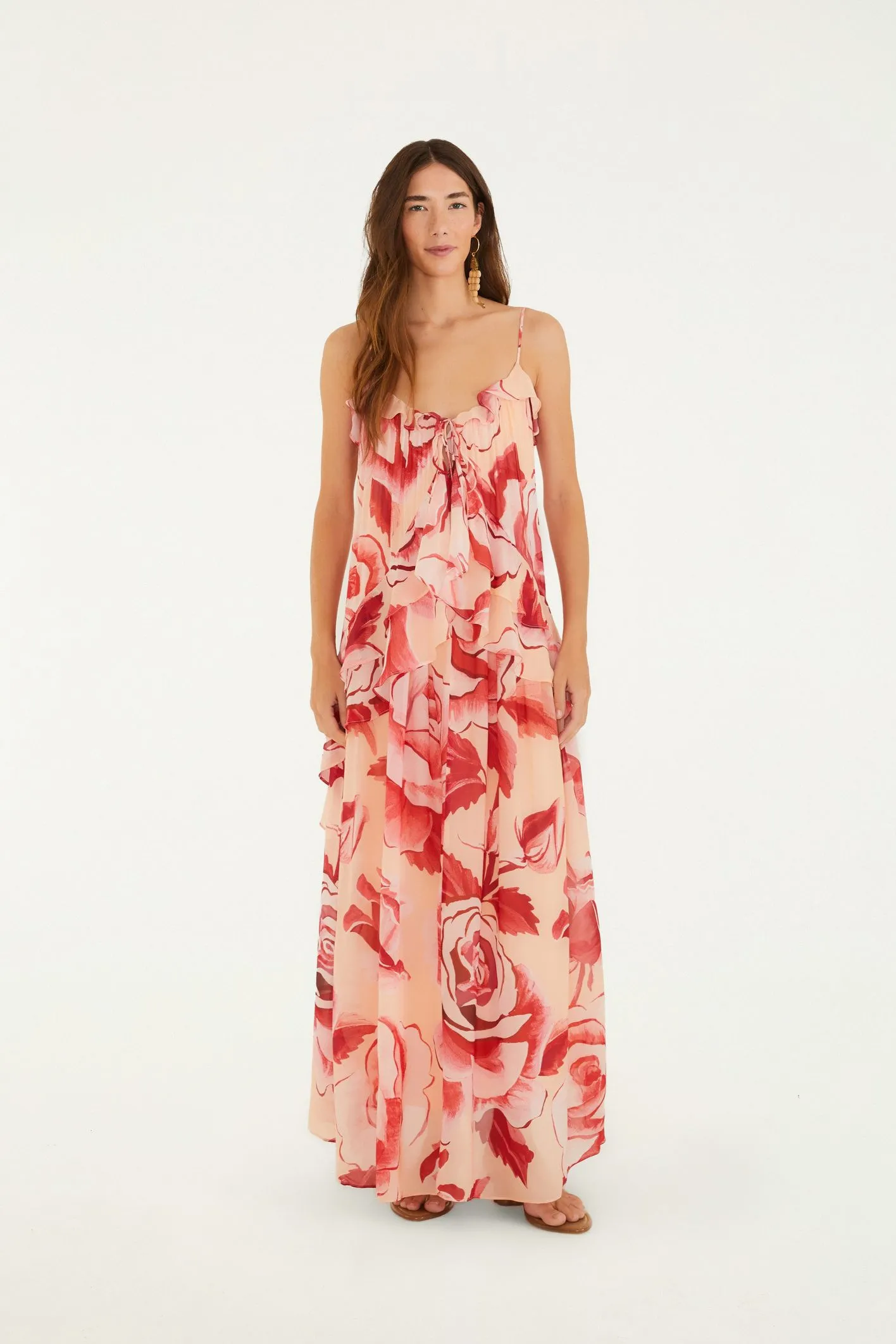 Vestido longo estampado rosas pintadas. traz um decote suave e alças finas que oferecem um toque delicado. possui um corte fluido que proporciona leveza e movimento a cada passo. ideal para momentos casuais ou ocasiões que pedem uma peça com toque de arte e originalidade. FARM RIO original - verão 26.