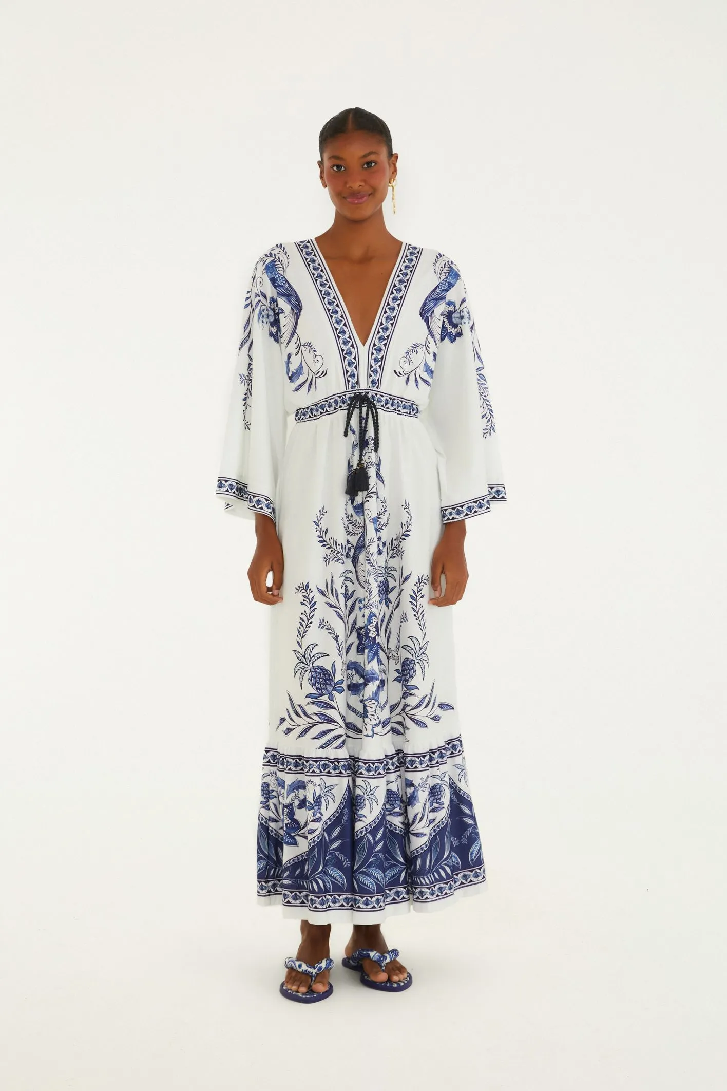 Vestido midi estampado nina. com decote profundo e alças delicadas, o modelo é perfeito para dias ensolarados. a modelagem solta proporciona conforto, enquanto o acabamento traz originalidade à peça. ideal para um passeio casual, eleva qualquer produção do cotidiano. FARM RIO original - verão 26.